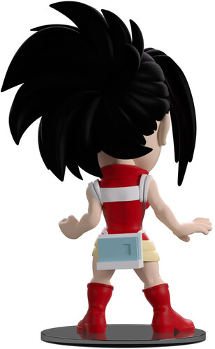 With a long thick black fringe falling down the front of her face as the rest is pulled back into a wild ponytail, she stands at 4.9 inches tall with a clenched fist and a confident smile! Wearing a red and white one piece costume with straps across its chest and waist, an ever useful book sits at her back as long red boots cover her feet.