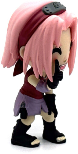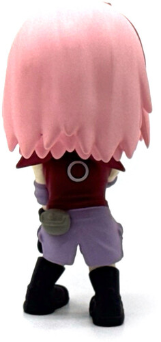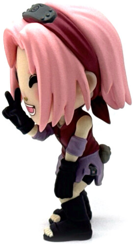 At 3.8 inches tall, she’s posed bending forward with an outstretched gloved hand making the peace sign while the other rests on her knee. A dark pink konoha headband sit atop her bright sakura pink hair, which falls down to surround her adorable rosy cheeked smiling face. She’d dressed in a dark pink sleeveless vest that zips up at the front and a light pink split skirt over shorts, with matching pink arm bands and brown open toe boots.