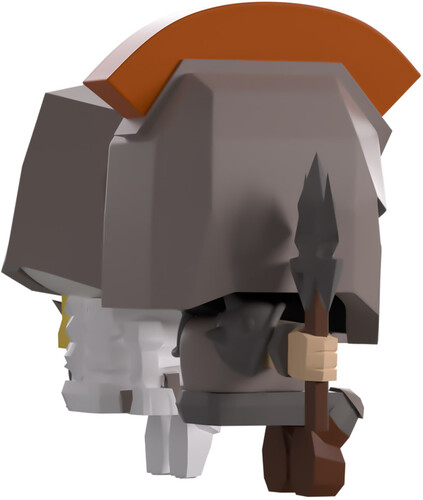 Sitting at 2.2 and 2.4 inches tall respectively, Tim holds a pointed spear to his side and wears a Tyras Helm over his head, along with matching grey armour that has spiked shoulders and brown boots.