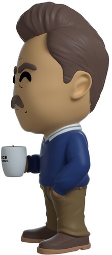 Ron stands at 4.8 inches tall, a stern look spread on his face. His left hand is in his pant pocket, while the other one is sporting a white mug with "Be Nice to Someone" printed in a black font. His attire consists of a blue sweater on top of a white dress shirt, completed with his brown pants.