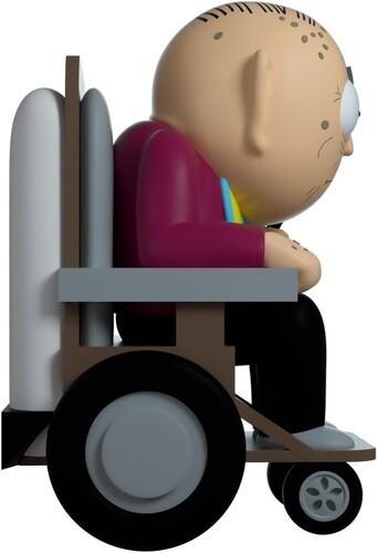 Grandpa Marsh is sculpted at 4.2 inches with an angry expression on his face. He is wearing a dark purple sweater with black pants and is seen sitting on his electric wheelchair. He is wearing a yellow and blue Happy Birthday bib and holds a black fork in his left hand.