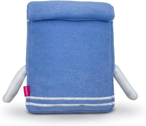At 9 inches tall, his rectangular purple body folds back at the top and is lined with four white stripes, while his large open eyes shine from above a smiling triangular mouth. Sat in perfect comfort, two yellow footed legs kick out in front of him lazily while his white arms flap out from his sides.
