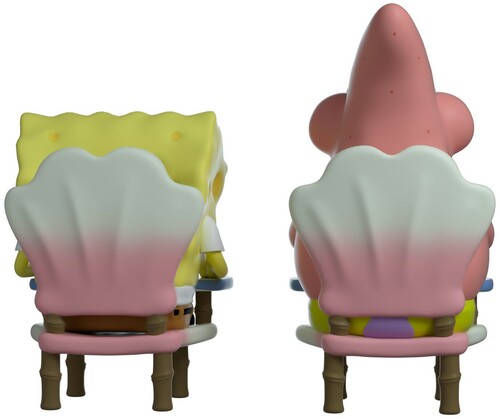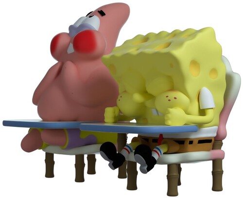 What’s Funnier Than 24 has been sculpted at 4 inches tall. It features two figures, SpongeBob and Patrick. SpongeBob sits, eyes squeezed closed, both fists on the table in front of him. He’s sculpted mid-laugh, cheeks puffed out with air. Patrick appears grinning, showing teeth, his cheeks red and puffed up with air.
