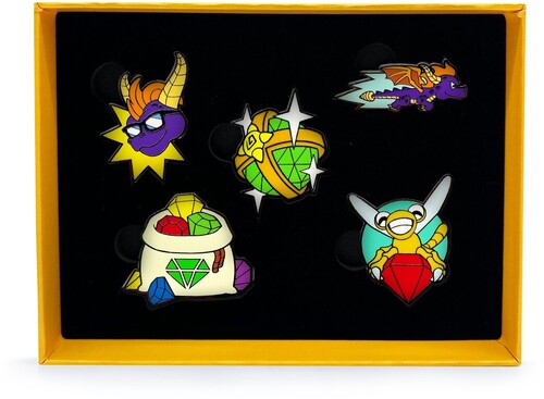This new high-quality enamel pin set includes 5 colourful Spyro-themed pins and includes Spyro with some sick shades on, a bag overflowing with multicoloured gems, Sparx holding a red gem, a sparkling green orb and Spyro zooming through the air.