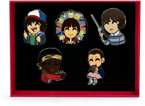 Containing 5 unique enamel pins that each measure in at 2 inches with a shiny, high-quality finish, the collection contains a cheery Dustin throwing a thumbs up, Mike with a walkie-talkie raised to his ear, Lucas about to let loose a slingshot, Eleven happily enjoying an eggo and Will surrounded by flashing Christmas lights.