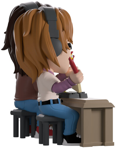 Tune in and turn it up! Robin and Steve have returned to Youtooz for a new figure! Sitting at 5.2 inches tall behind a beige table as huge smiles cross their faces and the cords of their grey headsets lead down to a soundboard, Robin wears a pink t-shirt over a purple long sleeve and holds a sign she’s scrawled ‘Applause!’ on with the red marker in her right hand.