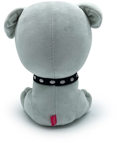 Sitting at 9 inches tall with a thick muzzle and drooping pointed ears atop his boxy head as his curved eyes peer forward, around his neck sits a studded black collar with a bone shaped name tag at its front while he kicks his back legs forward on either side of extended front paws.