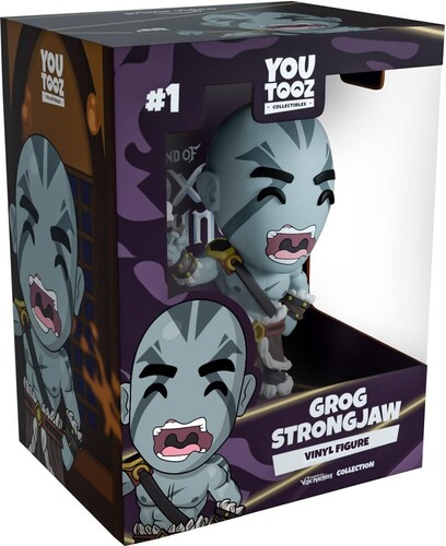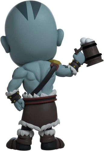 Grog Strongjaw is here, he is drunk and he is a Youtooz! The collectible stands at 4.5 inches tall. Grog is posed with a frothy beverage held aloft in his right hand. He is shown wearing his classic fur-lined boots and pants. With his chiseled muscular gray torso only covered by a strap holding his shoulder pad. His mouth is agape in a rippling shape showcasing a manly belch.