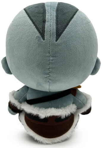 This plush cutie sits on his soft barbarian butt, dressed in his iconic outfit. With his brown boots, pants and skirt. Complete with his armbands and shoulder pad, connected by a cross-body strap. His belt and arm cuffs are trimmed with faux fur trimming, while the rest of the plush is a mix of Sublimated minky and regular minky material. Decorated across his light grey body are his darker grey tattoos and scars.