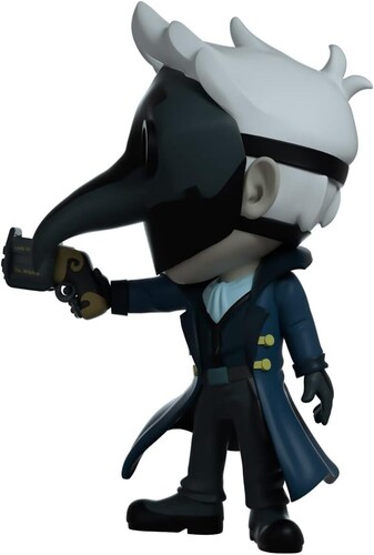 Percy stands at 5 inches tall, with his gun cocked and ready in his right hand. He has been made wearing his notable plague doctor mask covering his face, his classic and fashionable blue trench coat over his dapper slacks and sweater.