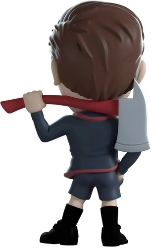 Standing at 4.6 inches tall with a red-handled fire axe swung over his shoulder casually and one hand resting in the pocket of his shorts, a stern look crosses his face with thin pursed lips as his short brown hair is swept over to the side with its fringe curling down onto his forehead. Always looking smart, he wears a dark blue blazer over a black, red and white argyle vest along with a white shirt and tie, while his long black socks feed into laced dress shoes.