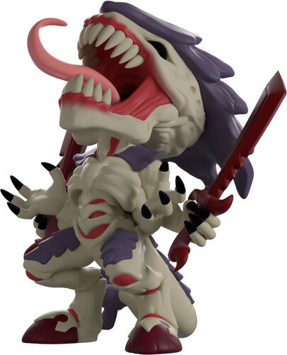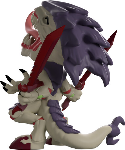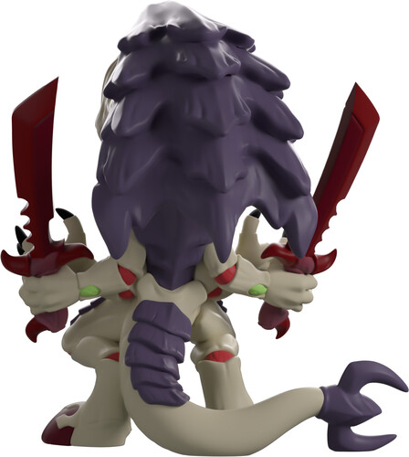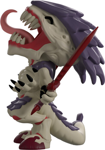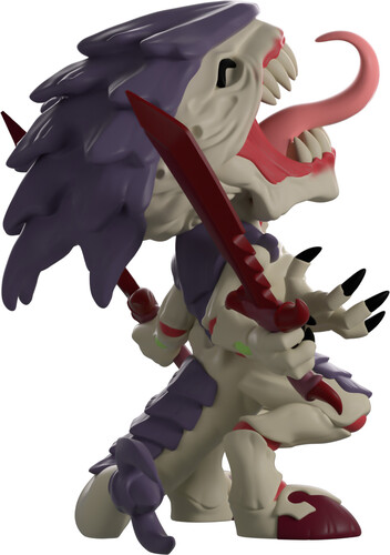 The swarm has arrived at Youtooz! Leaning back as they let out a blood-curdling screech at 4.2 inches tall, a pink tongue curls out from behind sharp teeth as a purple carapace juts out from their grey head. With a pair of red bone swords held in two of their hands as the other two open out to their front, red muscles peer through a bony torso and their knees, as a thick tail wraps around from the back with a sharp three-pronged tip.