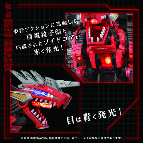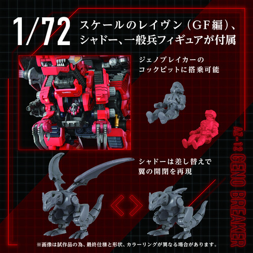 By activating the electric unit, you can achieve the powerful, dinosaur-like walking motion. The transformation into the charged particle cannon firing form, a distinctive feature from the anime, can be manually reproduced. Eyes, charged particle cannons, and the Zoids Core illuminate with LED lights. As a unique feature of the Genobreaker, the Exbreaker mounted on the back opens and closes in sync with the walking motion. Includes a 1/72 scale anime character figure of Raven (GF Edition) and an original soldier figure that can be seated in the cockpit. Also includes a 1/72 scale standing pose figure of Shadow.